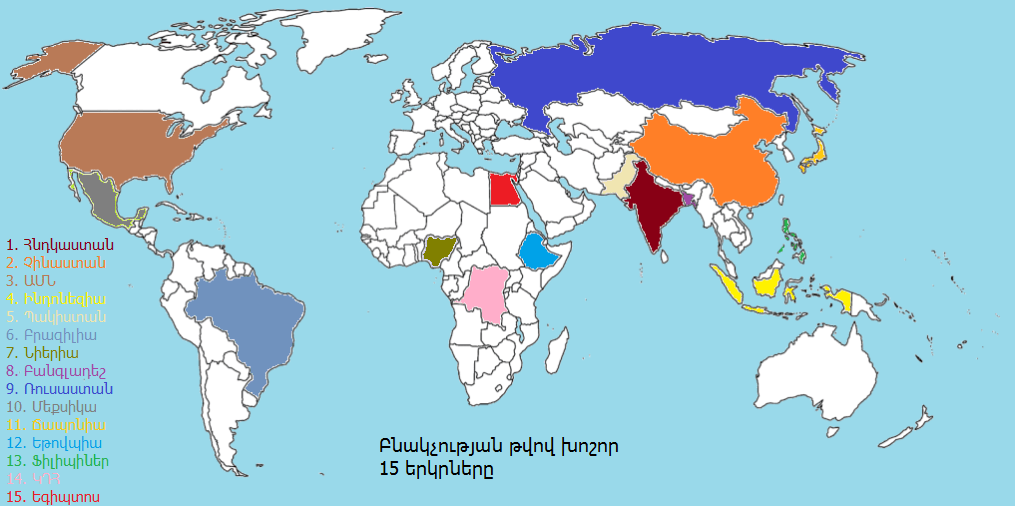 4,Ուրվագծային քարտեզի վրա նշել բնակչության թվով խոշոր 15 երկրները։