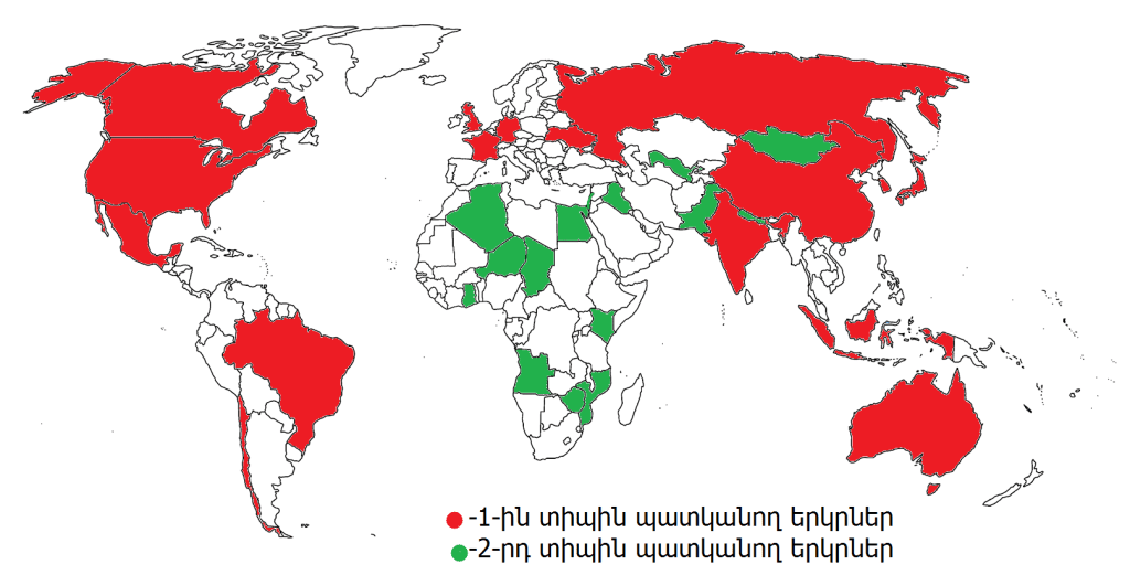 Առաջին տիպ-Կանադա, Բրազիլիա, Ֆրանսիա, Իսպանիա, Սինգապուր, Չիլի, Ավստրիա, Չինաստան, Մեծ Բրիտանիա, Մեքսիկա, Արգենտինա, Հունաստան, Իտալիա, Ղազախստան, Նորվեգիա, Գերմանիա, Հնդկաստան, Բելառուս, Ավստրալիա