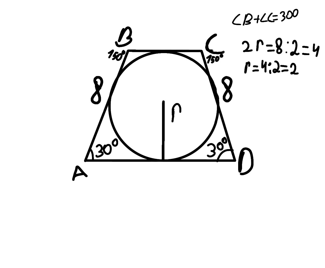 5)Հավասարասրուն սեղանի սրունքը 8սմ է, իսկ փոքր հիմքին առընթեր անկյունների գումարը՝ 300օ ։ Գտեք այդ սեղանին ներգծած շրջանագծի շառավիղը։