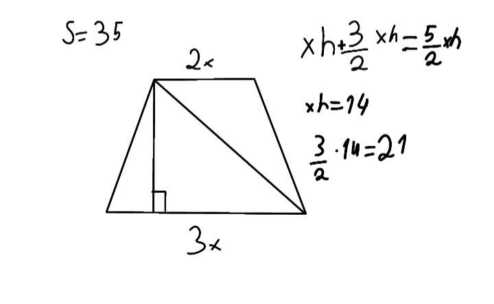 4)35 սմ2 մակերեսով սեղանի հիմքերը հարաբերում են ինչպես 2:3: Գտե՛ք եռանկյունների մակերեսները, որոնց տրոհվում է սեղանը իր անկյունագծով: