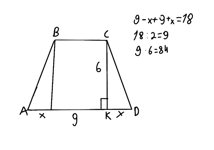 6)CK-ն ABCD հավասարասրուն սեղանի C գագաթից AD մեծ հիմքին տարված բարձրությունն է: Գտեք սեղանի մակերեսը, եթե CK = 6 սմ, AK = 9 սմ: