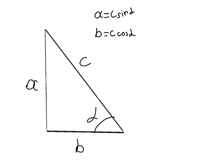 2)Ուղղանկյուն եռանկյան ներքնաձիգը c է, իսկ սուր անկյուններից մեկը՝ α: Էջերն արտահայտեք c-ի և α-ի միջոցով: