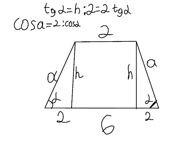 3)Հավասարասրուն սեղանի հիմքերը հավասար են 2սմ և 6սմ, իսկ մեծ հիմքին առընթեր անկյունը հավասար է α։ Գտեք սեղանի բարձրությունը և սրունքը։