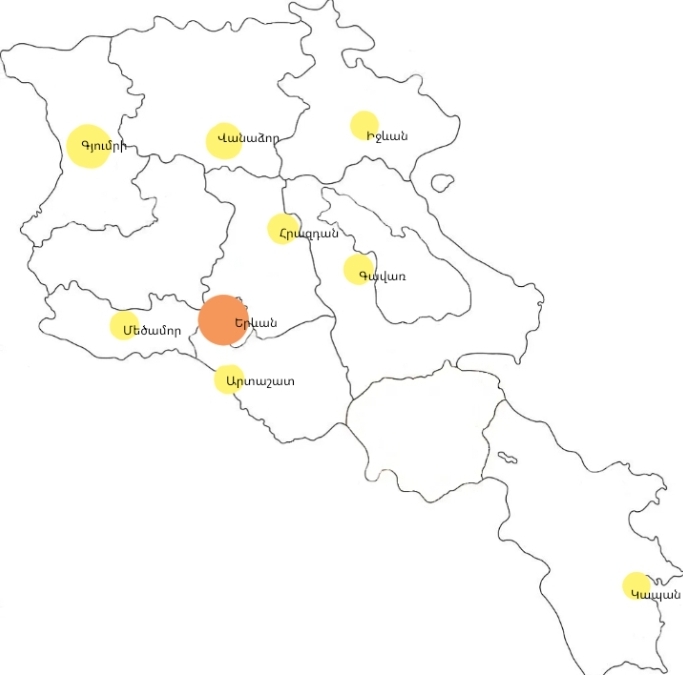 3. Ուրվագծային քարտեզ վրա նշել մարզերն ու խոշոր քաղաքները։