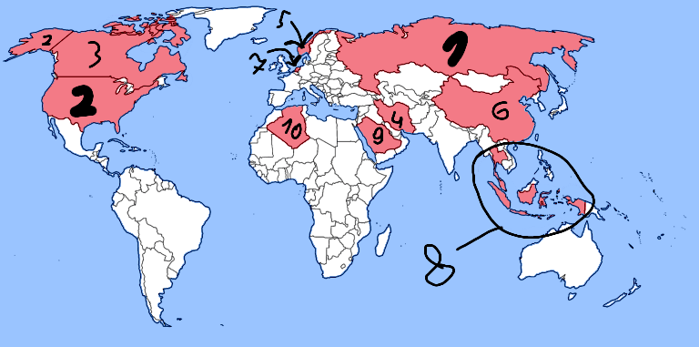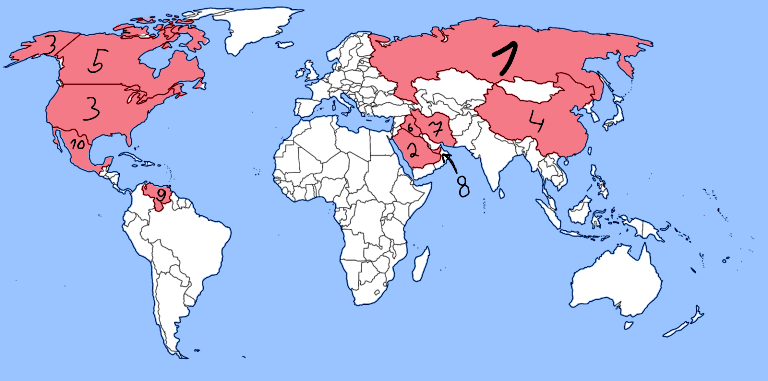 1․ Քարտեզի վրա նշել նավթ, գազ և ածուխ արդյունահանող առաջատար երկրները: