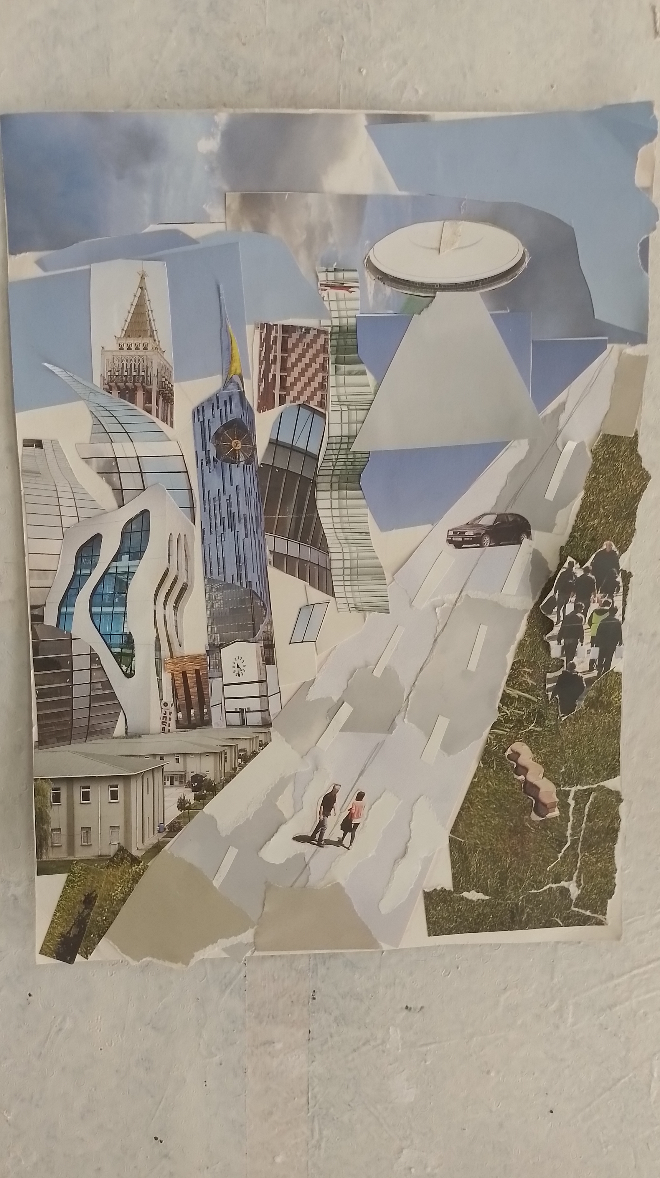 Օրինակ` այս կոլաժում պատկերված է քաղաք, որը ունի իր տարօրինակությունները։